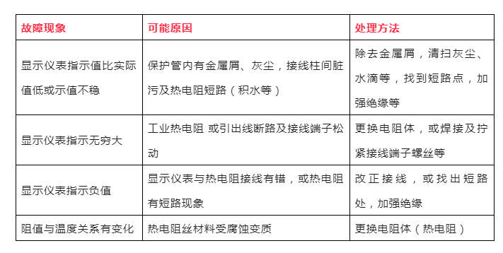 工業(yè)熱電阻的常見故障是工業(yè)熱電阻斷路和短路。一般斷路更常見,這是因為熱電阻絲較細所致。斷路和短路是很容易判斷的,可用萬用表的“×1Ω”檔,如測得的阻值小于R0,則可能有短路的地方;若萬用表指示為無窮大,則可判定電阻體已斷路。電阻體短路一般較易處理,只要不影響電阻絲長短和粗細,找到短路處進行吹干,加強絕緣即可。電阻體斷路修理必須要改變電阻絲的長短而影響電阻值,為此以更換新的電阻體為好,若采用焊接修理,焊接后要校驗合格后才能使用。熱電阻測溫系統(tǒng)在運行中常見故障及處理方法如下表: