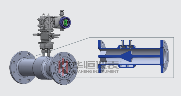 V形內(nèi)錐式節(jié)流裝置包括一個(gè)在測(cè)量管中同軸安裝的尖圓錐體和相應(yīng)的取壓口。該測(cè)量管是預(yù)先精密加工好的,在尖圓錐體的兩端產(chǎn)生差壓。此差壓的高壓(正壓)是在上游流體收縮前的管壁取壓口處測(cè)得的靜壓力,而低壓力(負(fù)壓)則是在圓錐體朝向下游端面,錐中心軸處所開取壓孔所得。而其高低壓之差的開平方與其體積流量成正比關(guān)系,通過測(cè)量V錐上下游的差壓進(jìn)而得出流量。