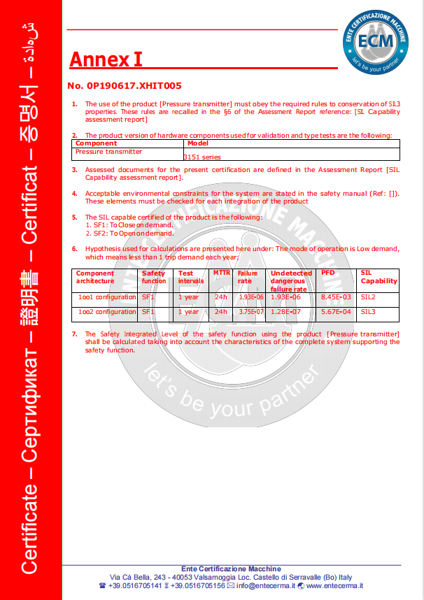 壓力/差壓/液位變送器SIL2(SIL3)認證證書