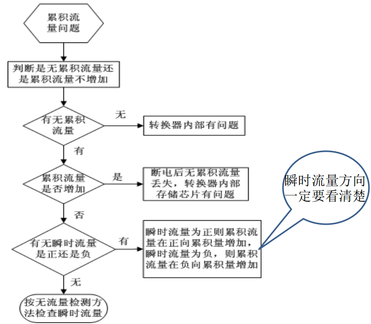 無流量信號、信號波動、零點不穩(wěn)、無累積信號、流量測量值與參比值不符,通常檢查整個測量系統(tǒng)和判斷故障的程序如圖: