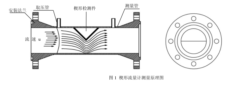 楔形流量傳感器結(jié)構(gòu)如圖1所示。楔形流量傳感器的檢測(cè)件是楔形孔板,它是一塊V形節(jié)流件,它的圓形頂角朝下,這樣有利於含懸浮顆粒(粉塵、泥沙及其它固體顆粒)流體和高粘度液體流過時(shí)在節(jié)流件上游側(cè)不會(huì)產(chǎn)生滯流,也不會(huì)在節(jié)流體上、下游側(cè)發(fā)生固體顆?;蛘吵砦锏姆e存,從而確保了楔形流量傳感器長(zhǎng)期運(yùn)行穩(wěn)定性:±0.1FS%Y,這樣高的長(zhǎng)期運(yùn)行精度在流量測(cè)量領(lǐng)域是迄今少見的。
