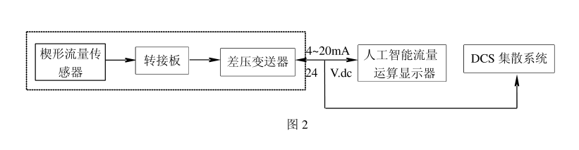 一體化智能型楔形流量計(jì)的組成如圖2所示。它由一體化楔形流量變送器和人工智能流量運(yùn)算器兩部分組成。其中一體化楔形流量變送器由楔形流量傳感器、轉(zhuǎn)接板和差壓變送器構(gòu)成。一體化智能型楔形流量計(jì)的工作原理是:當(dāng)充滿管道的流體流經(jīng)楔形孔板時(shí),其下游側(cè)動(dòng)壓增加,靜壓減小,由差壓變送器在楔形孔板下游側(cè)測(cè)出流體的差壓,并將差壓信號(hào)轉(zhuǎn)為4~20mA.dc電流信號(hào)輸出,此信號(hào)經(jīng)人工智能流量運(yùn)算器處理后,其示值即為流量值。