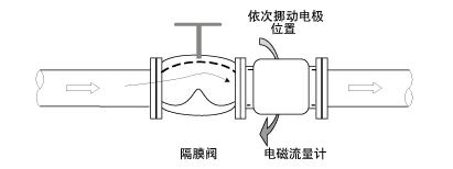 即使平時(shí)將隔膜閥完全打開使用,也會(huì)由于流速分布不均使電磁流量計(jì)產(chǎn)生幾個(gè)百分點(diǎn)的誤差。把電磁流量計(jì)安裝至閥門的上游可以解決問題,但是由于過程運(yùn)行上不允許這樣做,所以利用電磁流量計(jì)的安裝螺孔,依次挪動(dòng)電極位置,找到一個(gè)可以獲得最接近理論流量值的位置(如下圖),便解決了問題。