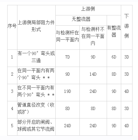 1、安裝檢測桿的測量段應是直的,其上下游直管段長度參照下表所規(guī)定的長度,序號上游側局部阻力件形式上游側下。